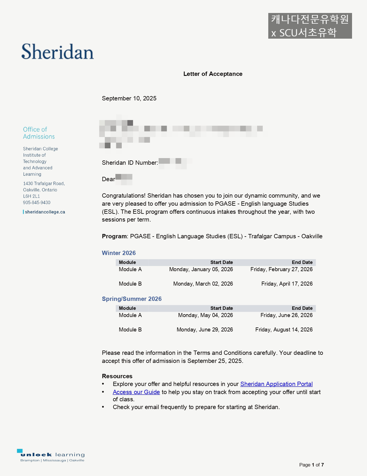 이번 2026년 1월 학기 시작으로, 저희 SCU서초유학을 통해 접수한 학생분이 쉐리단 컬리지의 입학허가서(LOA, Letter of Acceptance) 를 발급받으셨습니다.