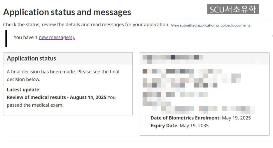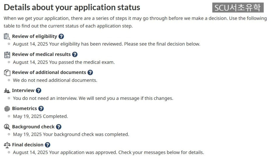 축하드립니다! 캐나다 학생비자 승인 소식이 있어 전해드립니다. 8/14에 Medical 업데이트 되었고, 그 날짜에 바로 승인이 되었습니다.